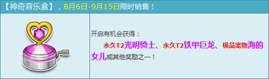 8月6日-9月15日,只需要在商城购买“神奇音乐盒”,开启就有机会获得永久T2机甲、极品宠物、极品套装、极品背饰、极品手杖或其他奖励之一。