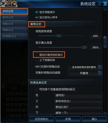如果玩家想在移动中也显示菜单栏和鼠标,需要在系统设定中进行设定。进入【系统设定】-【游戏设定】-【画面设定】勾选“移动中维持鼠标模式”。