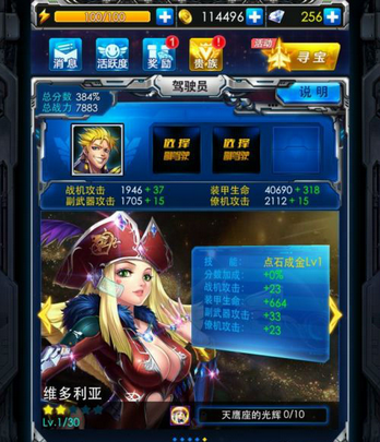 雷霆战机维多利亚是一个非常不错的驾驶员,该驾驶员最新上架,其满级属性和技能还是非常给力的,满级生命值达到了1627,攻击力加成也很不错,其技能为辅助性,能够让玩家你更多的获得金币,该驾驶员非常给力哦!所以玩家你值得入手该驾驶员哦!