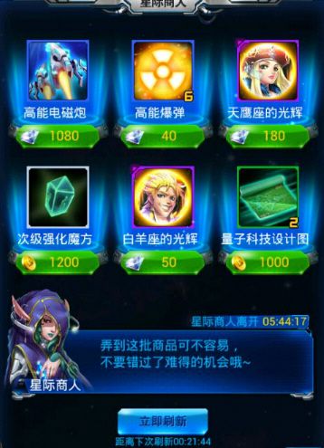 星际商人每次出现贩卖6项商品,每6小时刷新1次,可使用钻石手动刷新1次。