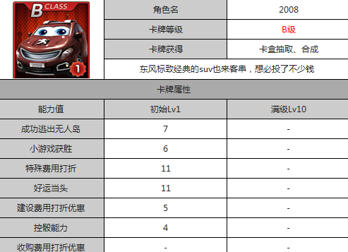 天天富翁2008是天天富翁里面的b级卡牌角色。它是一部汽车,而且还是东风标志牌的,虽然有做广告的嫌疑,但是也是游戏里面的要素。那么天天富翁2008怎么样 天天富翁2008好吗?现在满级属性还不得而知。从初始属性来分析,应该是不错的。