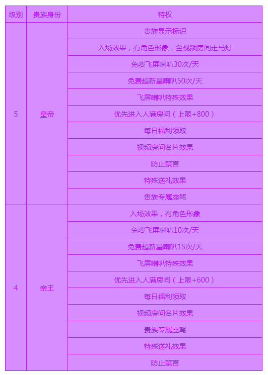 | 5 | 皇帝 | 贵族显示标识 入场效果,有角色形象,全视频房间走马灯 免费飞屏喇叭30次/天 免费超新星喇叭50次/天 飞屏喇叭特殊效果 优先进入人满房间(上限+800) 每日福利领取 视频房间名片效果 防止禁言 特殊送礼效果 贵族专属座驾 |