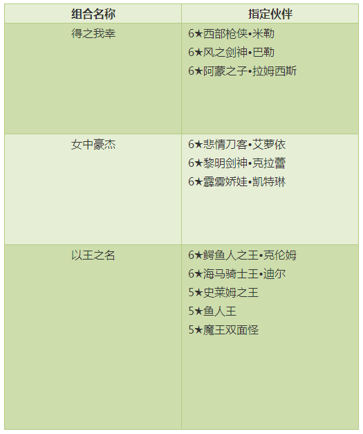 在8月15日中午12:00时,持有下表中任何一组所有指定伙伴,并将这些伙伴升级到30级和强化+5,即可于8月18日晚18:00起通过系统邮件获得6★装备兑换券一个: