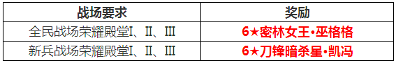 8月16日晚24:00结算时,全民战场和新兵战场达到下表要求的玩家,即可在8月18日晚18:00起通过邮箱获得对应的奖励,享受快人一步优先获得暂未开放6★伙伴的特权。