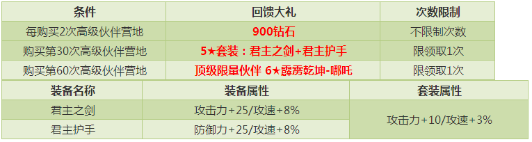 活动期间,购买高级伙伴营地达到以下条件,即可立即通过邮箱获得对应丰厚奖励!其中每购买2次高级伙伴营地,其中1次就可以享受半价优惠喔~