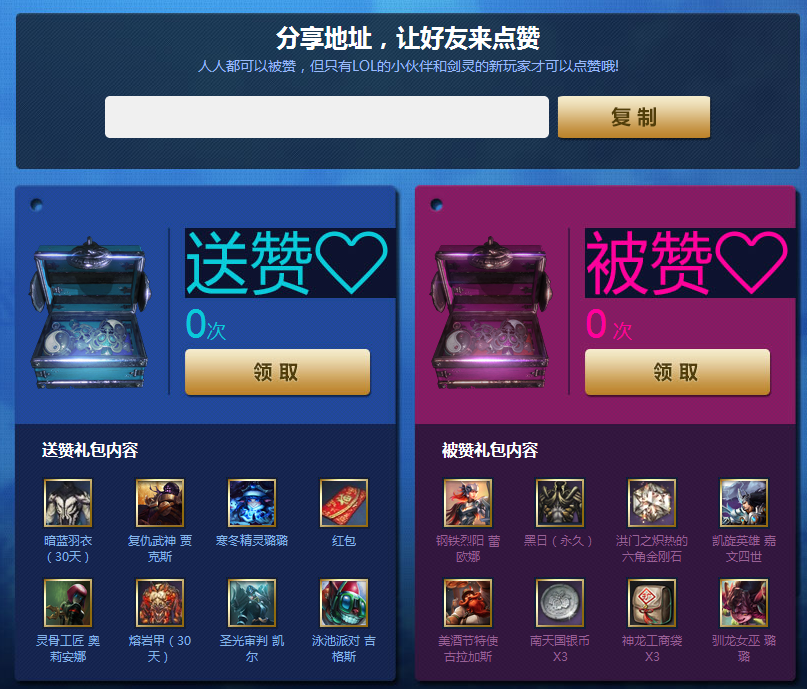 有很多网友还不知道lol互赞领皮肤活动,lol互赞领皮肤活动是lol为祝贺剑灵8月8日公测开启的活动,活动期间,集满32个赞或送出32个赞分别可以领取一个礼包随机开出各种豪华奖品。