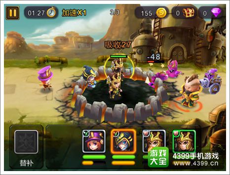 每个关卡都有3波怪物,英雄头像下方绿条代表英雄血量,越短则剩余血量越少,黄条代表能量。在战斗中,英雄每次对敌方造成伤害可获得一些能量值。当能量条满时,英雄头像发光就可以施放大招!技能高真实度的还原了英雄联盟的英雄技能效果。