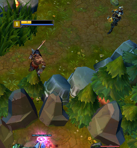 第二个图片中,拉克丝仍在追赶我,我面对石头人。这时候她还是有闪现,并且也能越过墙跟着我。而此时我的位置并不好,这时候唯一的办法就是成功欺骗她。
