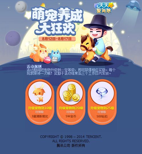 活动规则:活动期间把宠物升级到一定等级,在活动结束的三个工作日后,我们会把奖励发送到相应的游戏账户中。