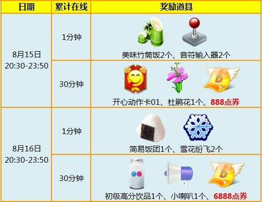 8月15日-8月16日,20:30-23:50 累积在线1分钟和30分钟即可领取7776点券+珍品道具。