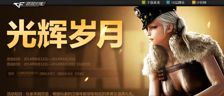 活动介绍:cf光辉岁月活动是针对老玩家举办的一个福利活动,活动无任何参与要求,只要你是cf老玩家即可到活动页面领取奖励,注册的时间越长奖励越好,奖励包含荣誉和道具礼包,下边西西来为大家介绍详细!