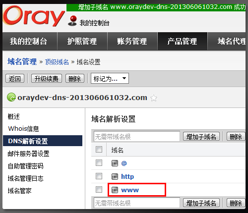 3、添加子域名成功