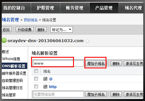 1、进入[我的控制台]-[产品管理]-[域名管理],点击域名根。