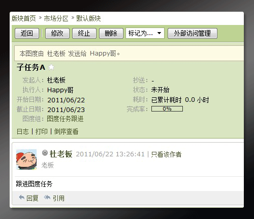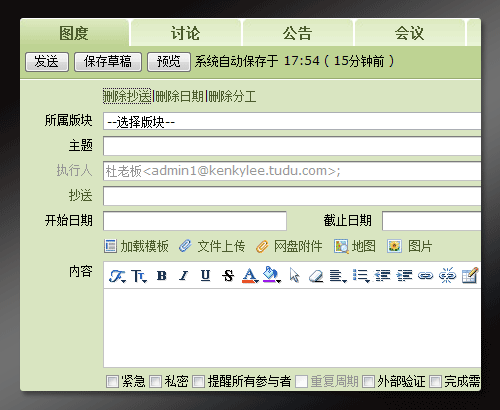 主任务区:包括所属版块、主题、内容等属性,可以进行添加抄送人、添加日期操作。(注意:可以理解为主任务的执行人是自己,系统自动将执行人设为自己本人);