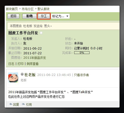 当接到子任务后,根据开发的功能不同,可以对其进行继续分工,点击“分工”