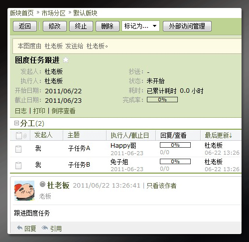进入图度分工查看页面后可查看跟踪每项分工的执行状态、进度以及最近回复等。