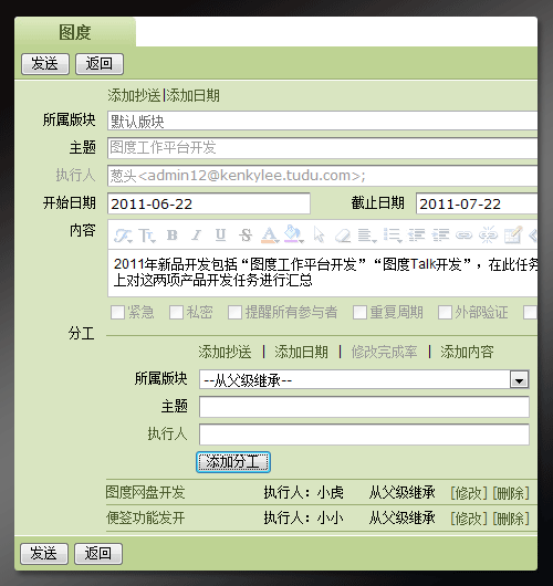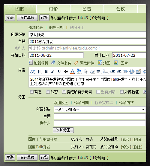 输入主题“2011年新品开发”,填写主任务相关内容;添加分工主题及相关执行人。