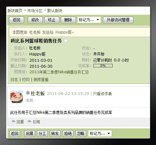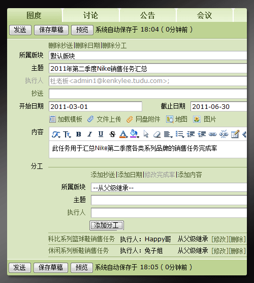 输入主题“2011第二季度Nike销售任务汇总”,填写相关内容,添加分工主题及相关执行人。