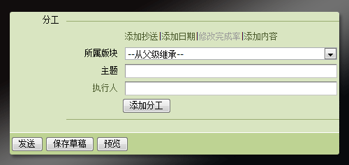 分工区:包括所属版块、主题、执行人等属性,同时也可以进行添加抄送、添加日期、添加内容等操作。