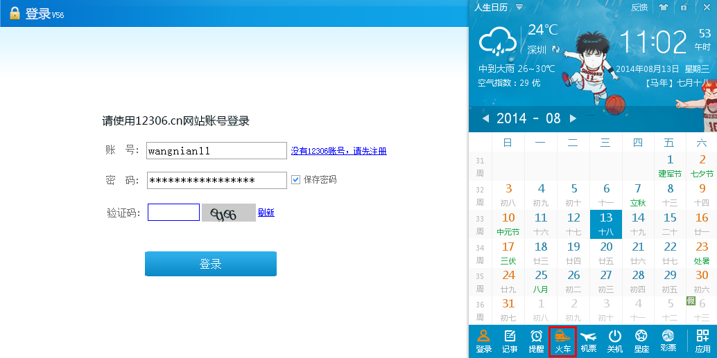 第一步你需要在电脑上安装下载人生日历最新版本,安装运行之后点击界面下方的火车小图标(第一次使用需要缓冲功能),在弹窗出来的12306登陆界面输入你12306账号密码进行登陆。