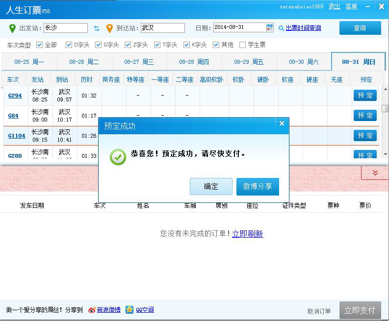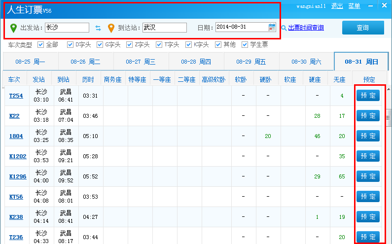 现在起至9月1号开学前的学生票都可在人生日历上购买,如某童鞋是要购买8月31号长沙开往武汉的车票,那么第二步就是在登录完成后选择好出发城市、到达城市和出发日期。学生票的预售期是30天,切记勾选学生票。选好车票后点击预订,就妥妥的进入最后的支付环节了。