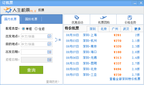 人生日历上面不仅可以轻松购买火车票,还能享受低至2折的折扣机票。如8月30日开学前一天深圳至上海的机票就低至2折起,直接点击深圳-上海即可购买,真是有人生日历在手,出行全不愁。