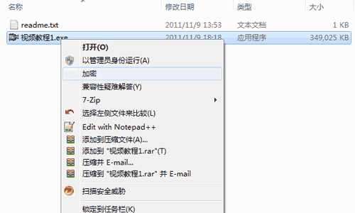 方法一:在要加密的文件上单击鼠标右键,在弹出菜单中选择加密。