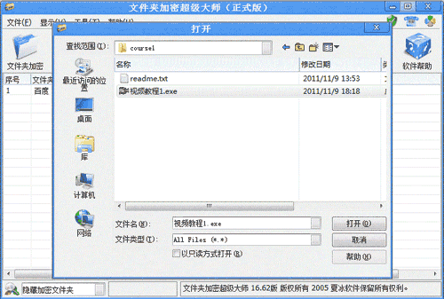 方法二:运行文件夹加密超级大师,点击文件夹加密超级大师窗口上的文件加密按钮,然后在弹出的窗口中选择需要加密的文件,然后后在弹出的文件加密窗口中输入加密密码,选择加密类型,然后点击确定。