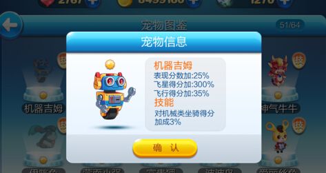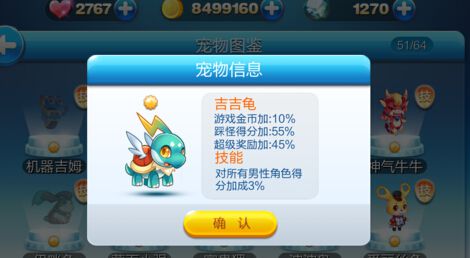 点评:机器吉姆所有属性全跟加分有关,配合超能【少年+小单车/白虎+魔女娜娜】将会有非常恐怖的得分加成,可以说是高手们必备的宠物!