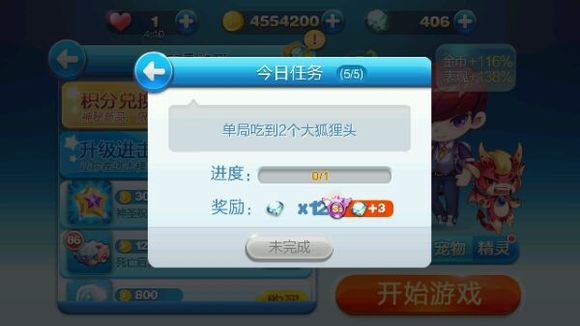 玩家需要进入任意模式来挑战,并且吃取各种大狐狸头,单局吃到2个大狐狸头哦!