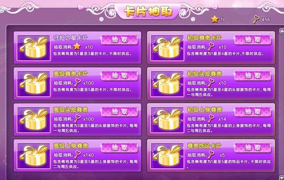 说到抽卡,也没有太多技巧可言,其实跟炫舞里很多抽奖的规律都差不多,无非是足够的兑奖道具和时间。所以小伙伴们打算要做的工作就是尽量收集更多的神秘钥匙,还有就是看看自己的大区哪个时段出高星卡概率大一些。