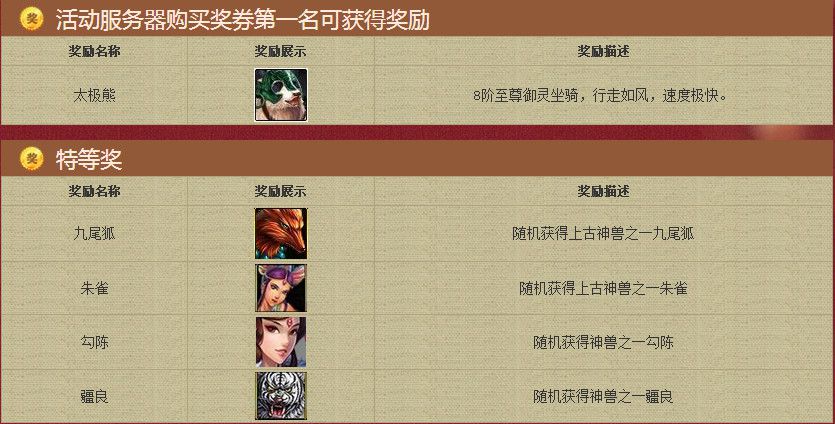 2活动期间“不见不散”服务器等级≥40级的玩家可购买奖券,每人购买数量不受限制,可批量购买。奖券价格为200金元宝(限量25万张,每个新服总计13个一等奖和7个特等奖神兽。)