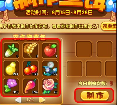 2、从左边农作物的背包中点击选择5种材料,点击右边的制作按钮就可以开始制作鱼饵啦!