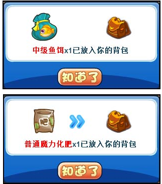 制作鱼饵活动奖励:普通鱼饵、中级鱼饵、普通魔力化肥等