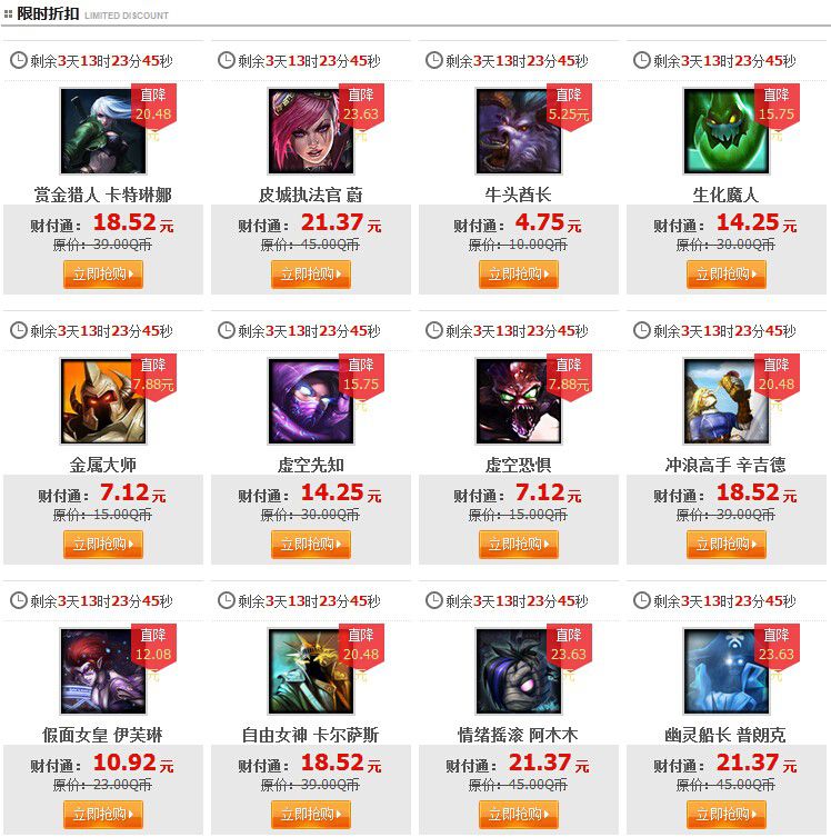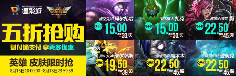 lol本周半价英雄出来了,有赏金猎人卡特琳娜 皮城执法官蔚 牛头酋长 生化魔人 金属大师,时间有限,活动结束日期是8月18号。本次的半价英雄皮肤主要是上图的几个比较经典五杀的系列皮肤,只要任意购买一款还可以得到五杀头像,你还在等什么,马上去抢购吧。感兴趣的朋友们可以了解一下。