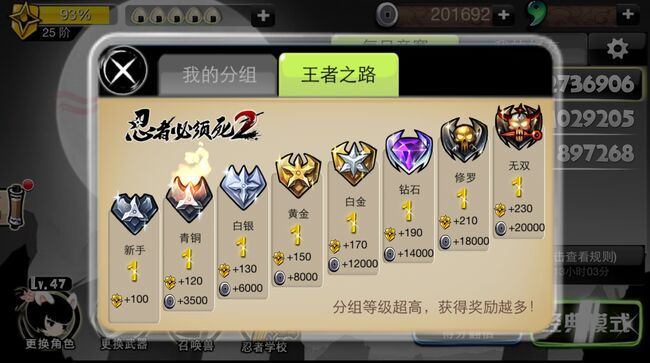 “疾风传说”革新了每日竞赛机制,开放“王者之路”天梯系统。根据玩家实力进行分组,实力越强组别更高,奖励更多。最高的“无双”组,第一名的奖励高达230声望,20000金币!玩家每周还可以获得一个勋章,收集勋章可以获得丰厚的奖励!