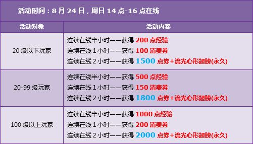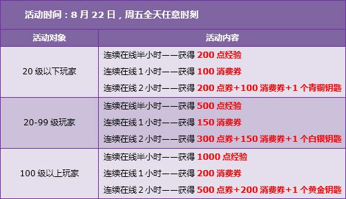 8月20日新版本发布,当天更新版本的玩家(3个大区不限),当天在任务面板查找【更新有礼】任务,点击“领取” 即可领取1000点券。仅在更新版本当天有效,请及时来更新版本哦!