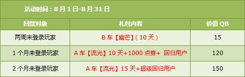 拥有【超级回归用户】道具的玩家,每天完成5局竞速赛,即可获得100点券+200消费券。
