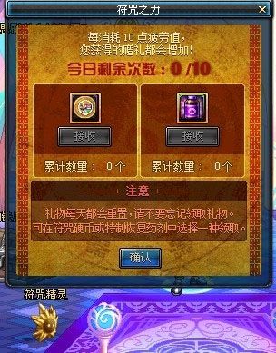 玩家每天上线,第一个进入的角色可以获得3个低级符咒,属性都非常的普通,有时间期限!不过玩家可以在赛利亚处,花10个符咒硬币买设计图升级,其中购买设计图需要符咒硬币和消耗100疲劳,符咒硬币,玩家可以点击符咒精灵获得硬币哦!