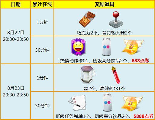 8月22日-8月23日,20:30-23:50 累积在线1分钟和30分钟即可领取6776点券+珍品道具。