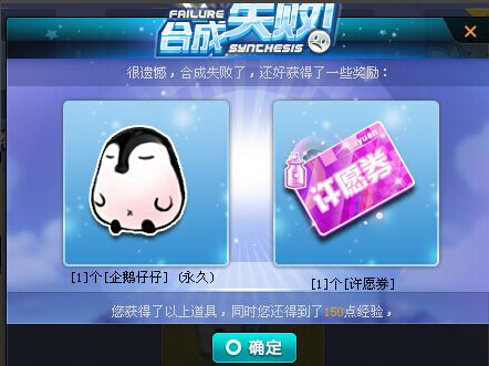 4、百分之2.5 多么小的几率,很明显是要失败的,无论成功还是失败,材料都会消失,不过会返还一个宠物和一张许愿券+150经验。