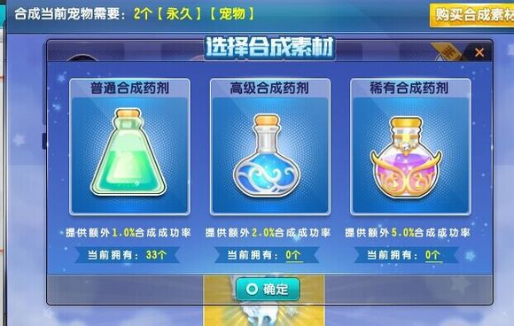2、需要放两个永久宠物上去,我把我的辣级宠物都扔上去了,第三个框是放合成剂的,有合成剂合不了宠物,每一种合成剂的合成几率也不一样。