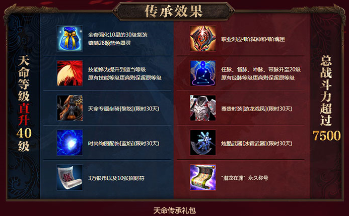 参与流程:与化龙使者对话并选择“潜龙在渊”,即可购买“天命传承”礼包,仅售488金币,原价48888金币。