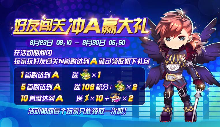 5首歌达到 A,送108积分+抵消3miss道具*2;