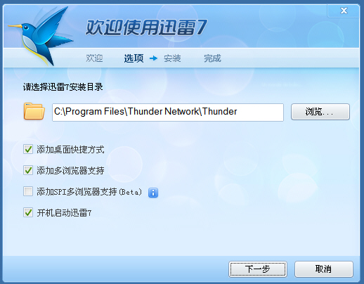 在默认的情况下是有:添加桌面快捷方式,添加多浏览器支持,开机启动迅雷。