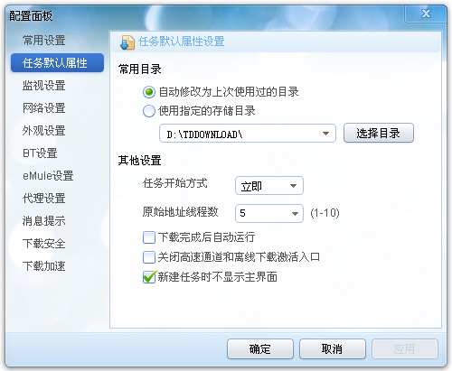 这里主要是设置任务默认属性,就是把常用目录设为使用指定的存储目录,这样子的话就不用每次都提示我们设置一次下载目录了。