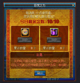 活动期间,每消耗10疲劳值即可在赛丽亚房间的符咒精灵处兑换1个【符咒硬币】或者1个【特制恢复药剂】,每天至多可以进行10次兑换!