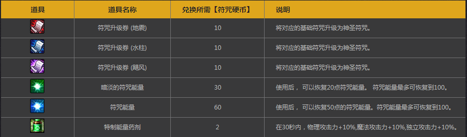 动期间,可以利用【符咒硬币】在赛丽亚的活动商店中兑换符咒升级和符咒充能的相关道具。