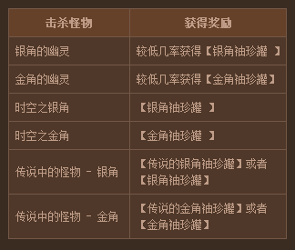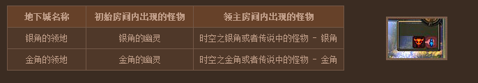 领主房间 内出现【时空之银角】和【时空之金角】,领主房间内也有一定的几率出现【传说中的怪物 - 银角】和【传说中的怪物 - 金角】。