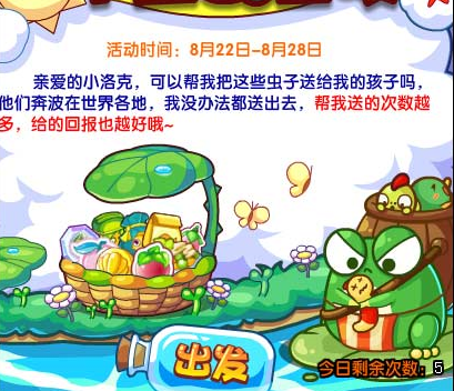 2、点击出发按钮,根据要求在5分钟内将小虫送给指定的孩子,送的次数越多,给的回报也越好哦